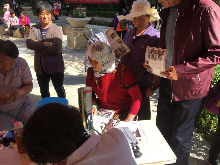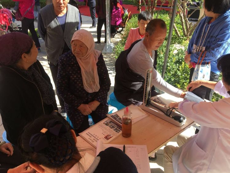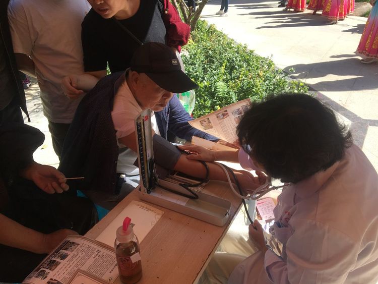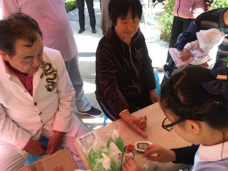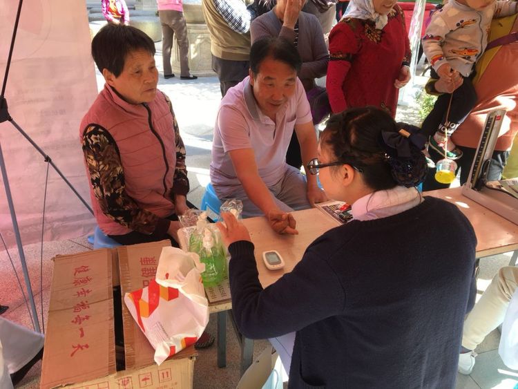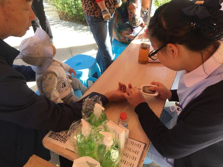 此次义诊,张主任和护士韩芳为小区居民提供免费的血压、血糖检测,同时还有小礼品发放。