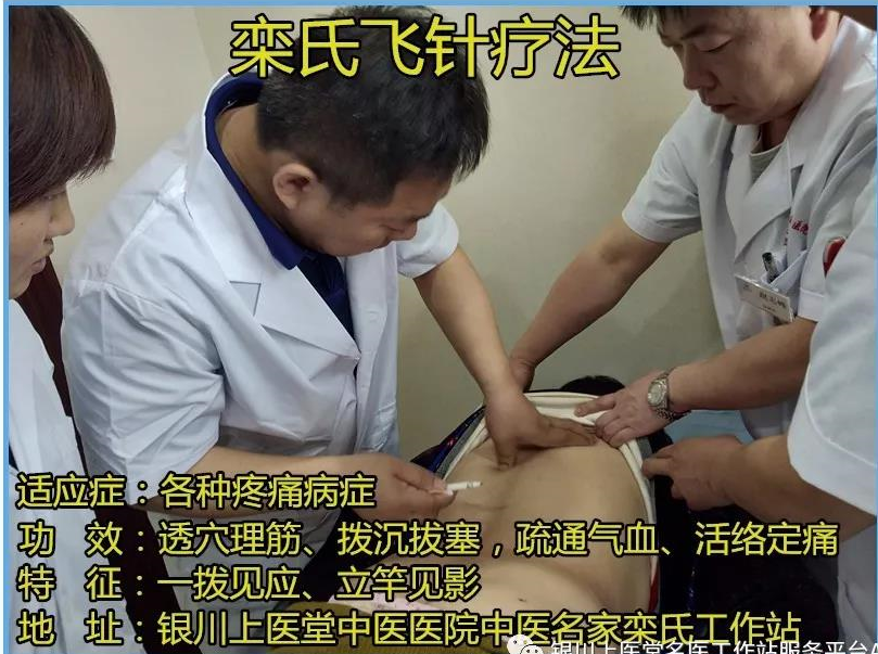 栾氏飞针疗法是古中医名家栾贻波教授在传承道家“风刺法”、“点刺法”等传统针刺技术基础上,结合多年临床实践经验而创新出的一种针刺新疗法。该法以毫针、圆利针、三棱针(锋针)等为针具,单手操作,集精、气、神于针下,针刺操作轻浅、快速不留针,形似“飞针”而著称。其特征是的聚精会神、带气行针,无痛效捷。