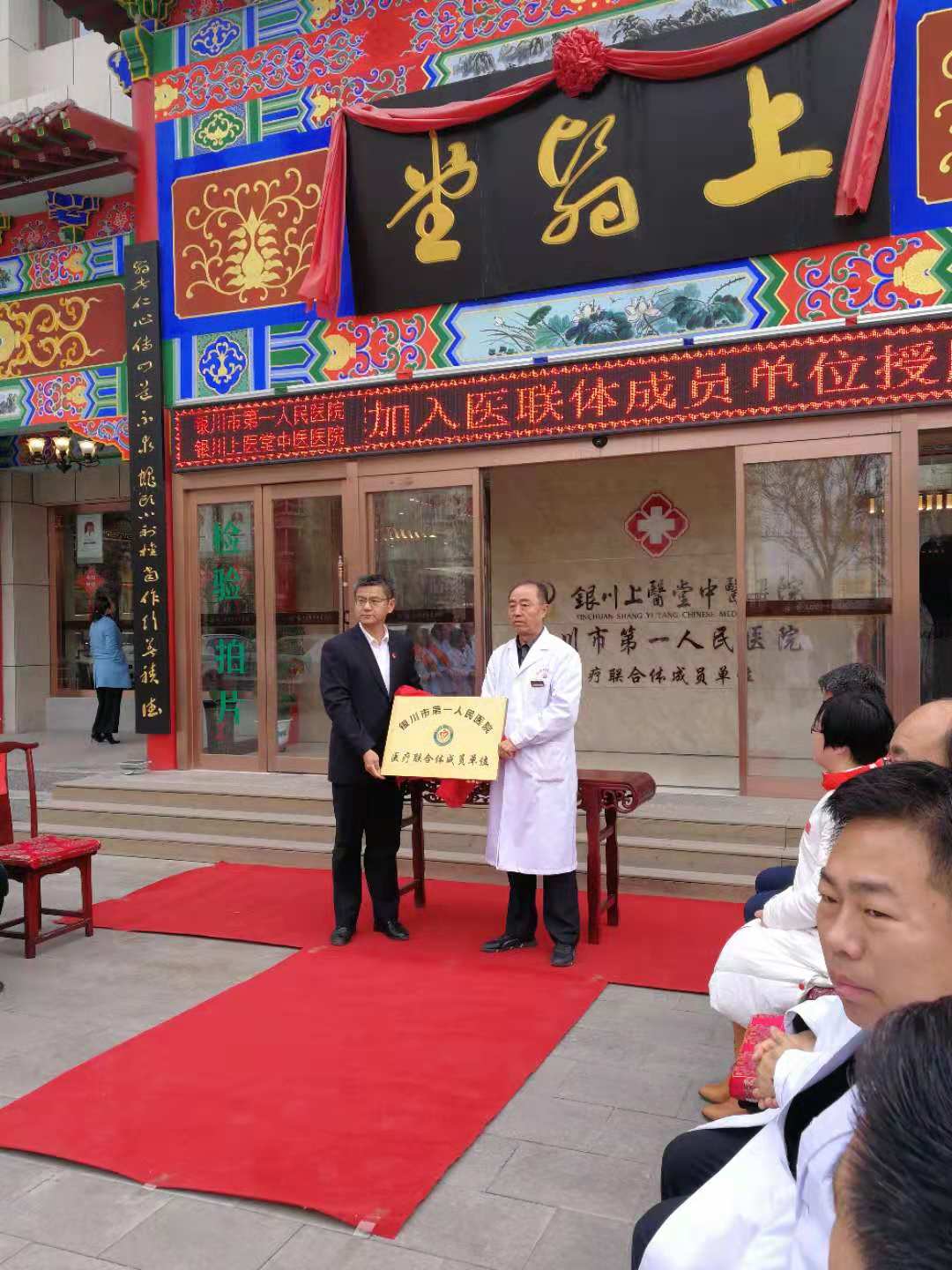 银川市第一人民医院副院长严京与银川上医堂中医医院院长武奎揭牌。